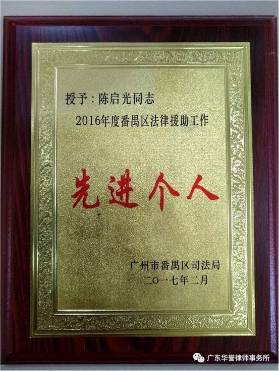 ※ 陈启光律师 荣获广州市番禺区司法局授予“2016年度番禺区法律援助工作先进个人” 称号
