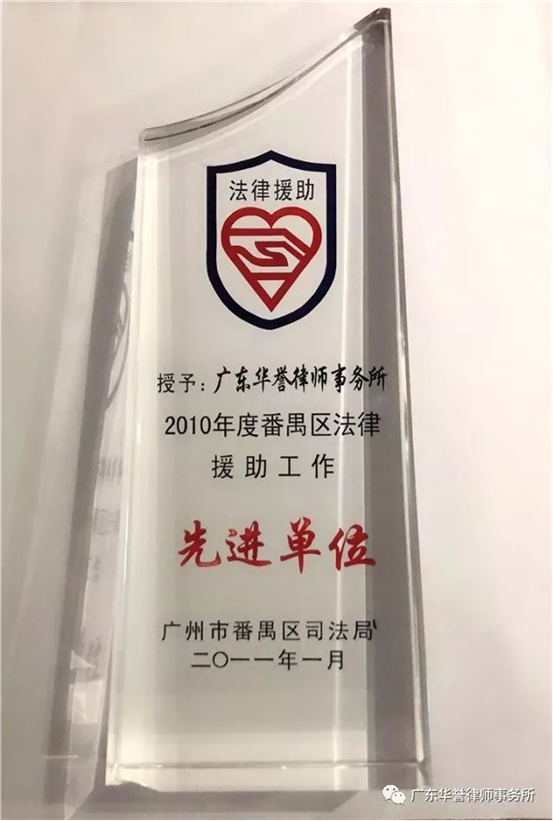 ※ 广东华誉律师事务所 荣获广州市番禺区司法局授予2010年度 “广州市番禺区法律援助工作先进单位” 称号
