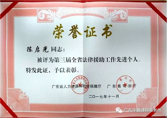 ※ 陈启光律师 2017年 荣获广东省人力资源和社会保障厅及广东省司法厅联合授予“第三届全省法律援助工作先进个人” 称号
