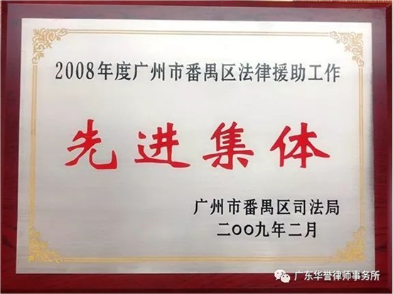 ※ 广东华誉律师事务所 荣获广州市番禺区司法局授予2008年度 “广州市番禺区法律援助工作先进集体” 称号
