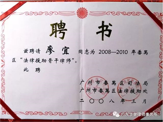 ※廖宜律师 2008-2010年度 获聘为广州市番禺区司法局、广州市番禺区法律援助处 “番禺区法律援助骨干律师”