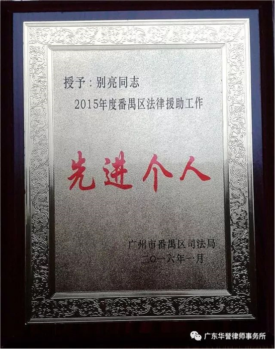 ※别亮律师 荣获广州市番禺区司法局授予“2015年度番禺区法律援助工作先进个人” 称号