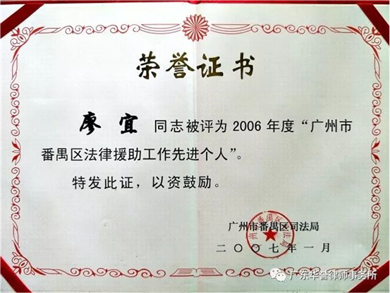 ※廖宜律师 荣获广州市番禺区司法局授予 “2006年度番禺区法律援助工作先进个人” 称号