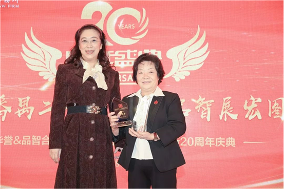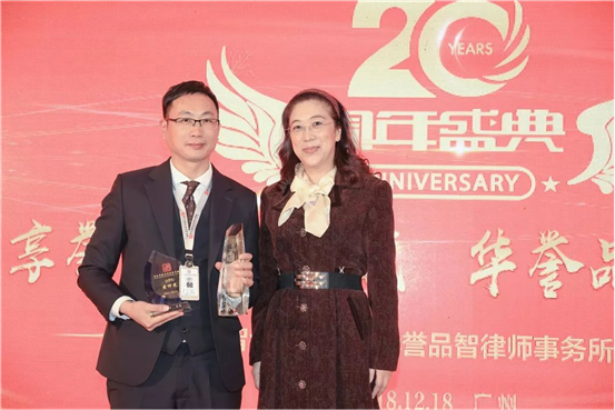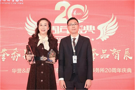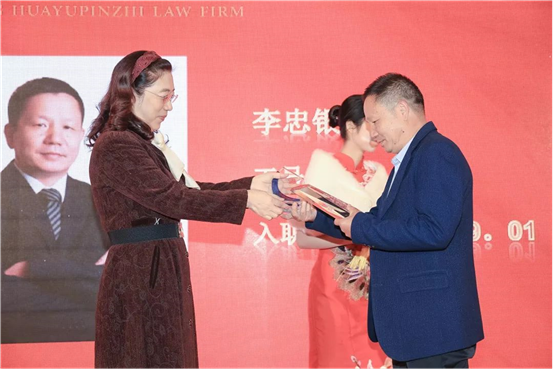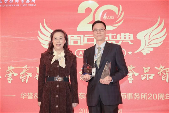 广东华誉品智律师事务所主任黄仲光律师,为崔建川律师颁发“001号”永久工号水晶杯和元勋奖,感谢她20年以来的倾心奉献。
