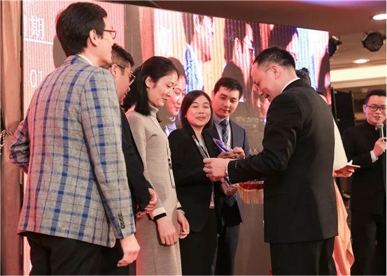 执行合伙人为十年以上入职年限员工颁发永久工号水晶杯与奉献奖。