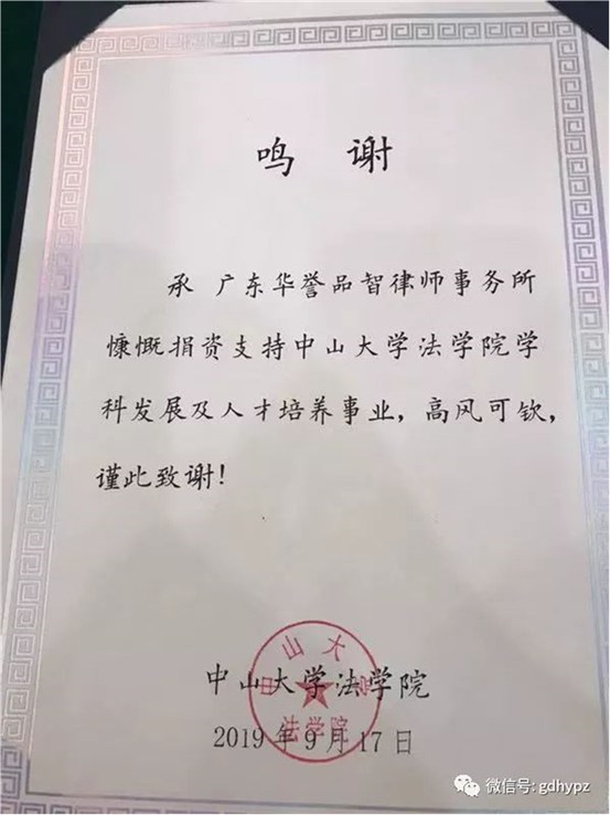 在邰忠智副校长、黄瑞敏主任、黄瑶院长、李明章书记及校友代表的共同见证下,广东华誉品智律师事务所为支持中山大学法学院学科发展及人才培养事业签署捐赠意向书,邰校长感谢律所的慷慨自主颁发了鸣谢证书。