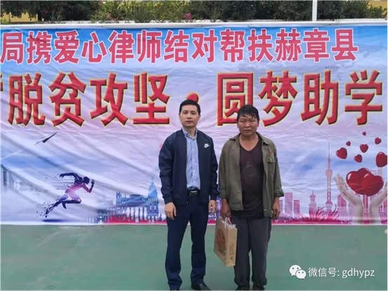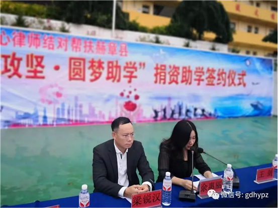 我所律师积极响应番禺区司法局号召,积极参与贵州赫章县对口帮扶工作。9月10日上午,我所委派合伙人王晓文、梁锐汉律师作为爱心律师代表,到赫章县罗州镇初级中学举行“脱贫攻坚,圆梦助学”结对帮扶贫困大学生签约仪式。