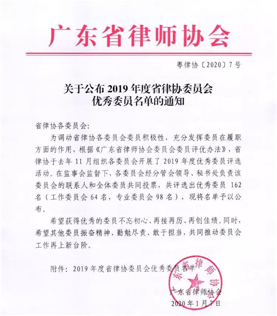 广东省律师协会组织各委员会开展了2019年度优秀委员评选活动。