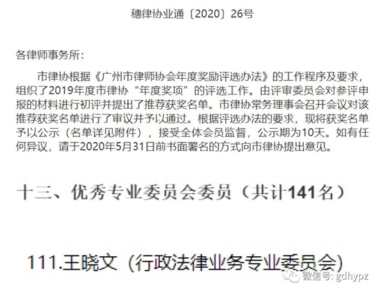 2020年5月22日,广州市律师协会对2019年度市律协“年度奖项”评选的获奖名单以“穗律协业通〔2020〕26号”公文予以公示,我所王晓文律师获评为行政法律业务优秀专业委员会委员。