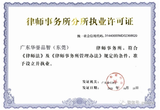 2020年初,为顺应广东华誉品智律师事务所在东莞业务发展的趋势,华誉品智经过数月的筹备,在各级司法部门及律协的指导和支持下,华誉品智(东莞)律师事务所于2020年6月18日正式获批并取得执业许可证,注册名称为“广东华誉品智(东莞)律师事务所”。