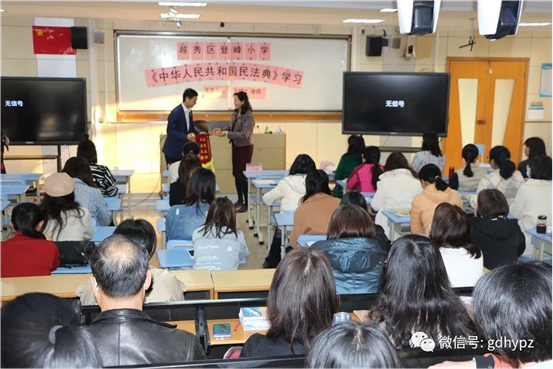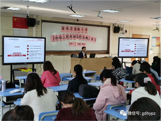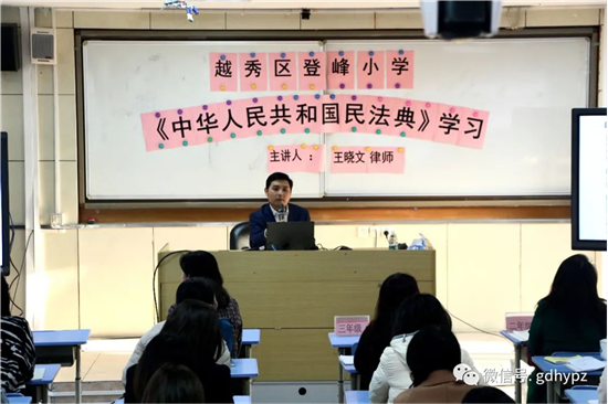 2020年12月4日,越秀区登峰小学开展律师进校园普法讲座,我所王晓文律师律师受邀为该校全体教师开展一场关于《民法典》的普法讲座。