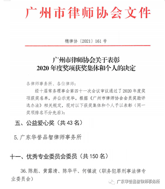 同时,我所何镇波律师也获评2020年度广州市律师协会职务犯罪刑事法律专业委员会“优秀专业委员会委员”称号。