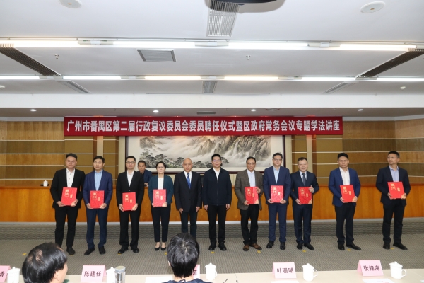 2023年12月6日,广州市番禺区人民政府举办第二届行政复议委员聘任仪式暨区政府常务会议学法讲座。我所王晓文律师受聘为广州市番禺区第二届行政复议委员会委员。番禺区区长叶珊瑚、广州市司法局副局长刘庆国为各位委员颁发聘书。